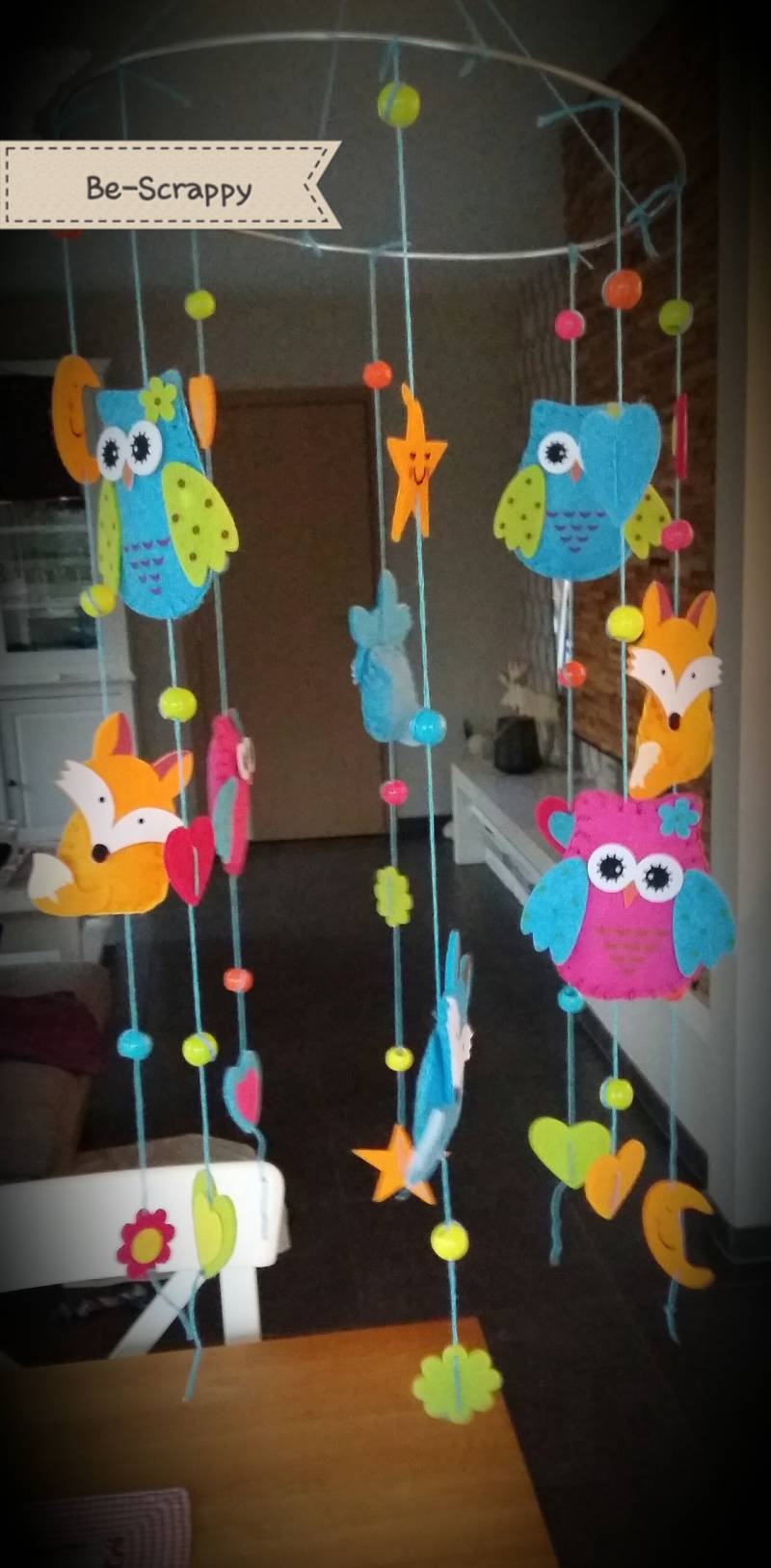 Een tijdje geleden lag er in de eetruimte op mijn werk een doos om deze vilten mobiel mee te maken. "Neem maar mee" hadden ze erop geschreven. Ik nam hem dus mee en vandaag vond ik eindelijk wat tijd om hem in elkaar te naaien.